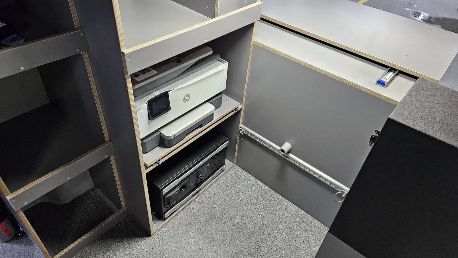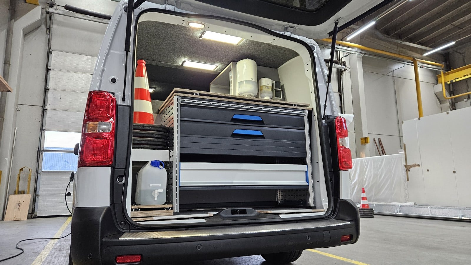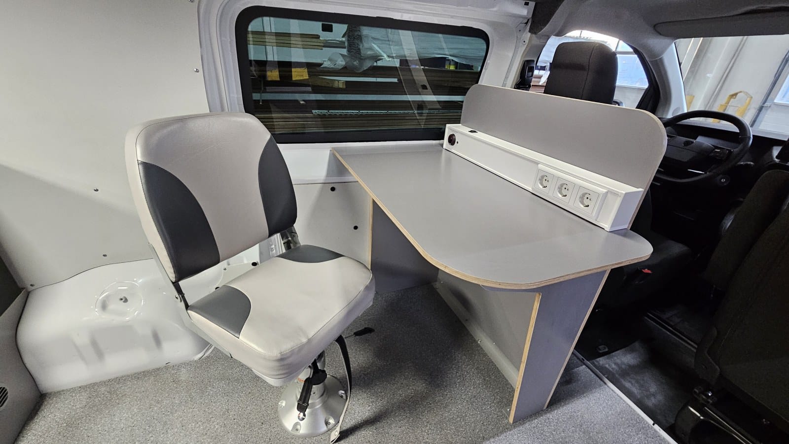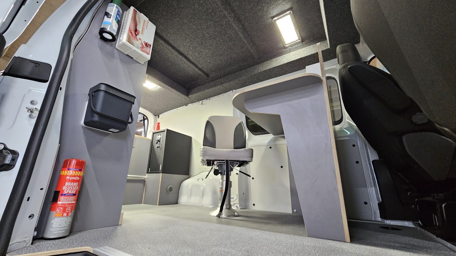 Deze mobiele werkplek is voorzien van een verhoogde hemel, een ergonomische bureau- en stoelopstelling, 230 V-voorzieningen én een professionele bedrijfswageninrichting met opbergvakken, lades en werkblad. Dit is de eerste van 36 units die nu in gebruik wordt genomen als basis voor het dagelijkse werk van ILT-teams in het veld.