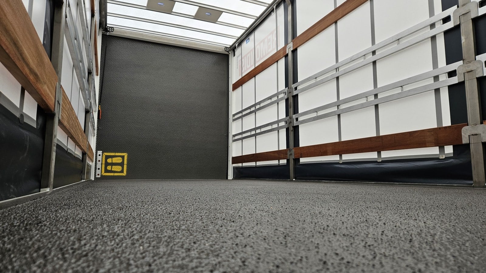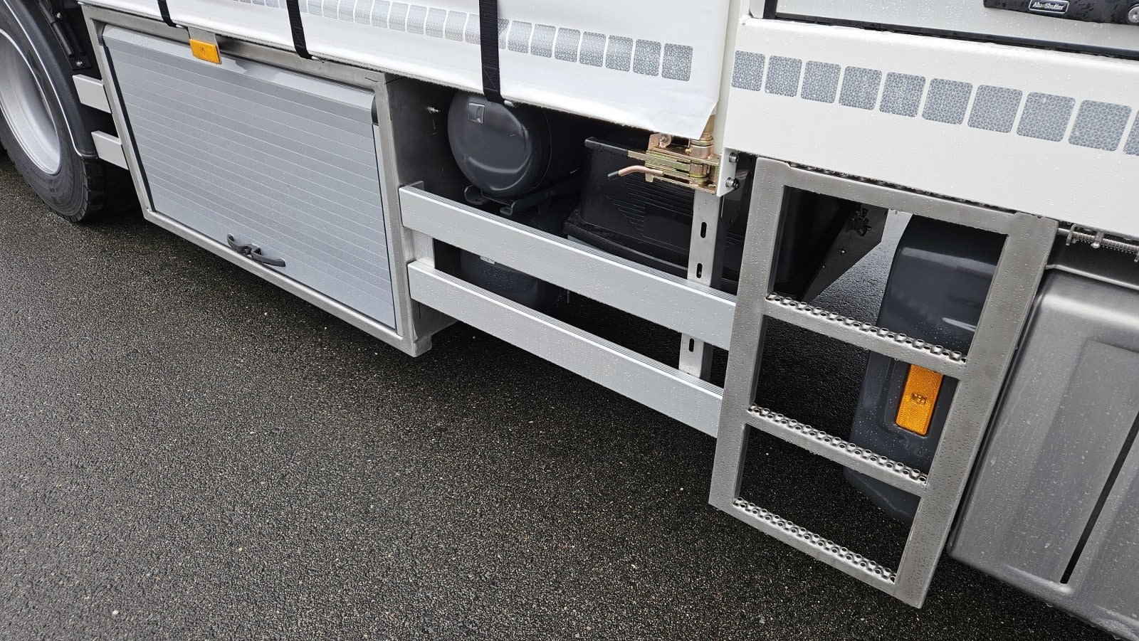 De carrosserie is uitgevoerd met een zuurbestendige laadvloer met anti-sliplaag, geschikt voor intensief en veilig gebruik. Het voertuig beschikt daarnaast over een achtersluitende laadklep, meerdere afsluitbare werk- en opbergkisten en een gescheiden compartiment voor een pompinstallatie, zodat materieel en installaties overzichtelijk en veilig zijn ondergebracht.